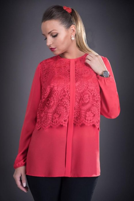Material: poliester si elastan Culoare: rosu Produs in Romania. Bluza fara elastic in talie si maneca lunga. Bluza vaporoasa si lejera la purtat. Marimi disponibile: 50 – 106 cm circumferinta bustului, 66 cm lungime