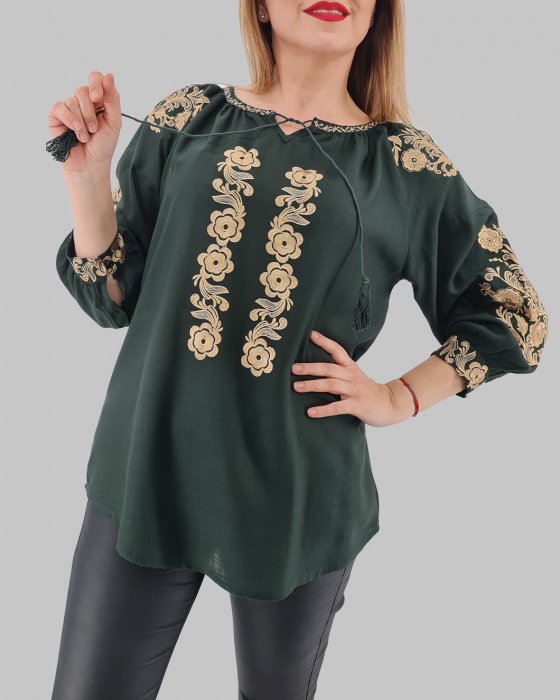 Comandă produsul Bluza verde brodata cu flori aurii Claudia la prețul de 129.0 lei