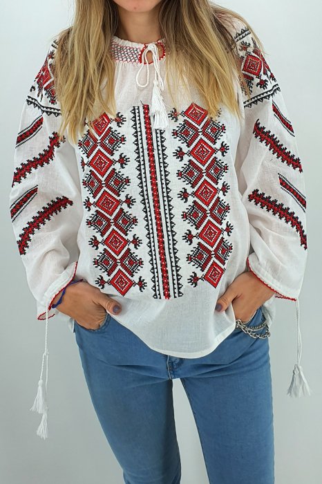 Ie din panza de bumbac 100%. Broderie cusuta la masina. Culoare: alb cu broderie, rosie si neagra. Marimi disponibile: S -100cm circumferinta bustului, 65 cm lungime, M -105cm circumferinta bustului, 65 cm lungime, L , 110cm circumferinta bustului, 66 cm lungime, XL , 115cm circumferinta bustului, 67 cm lungime. 2XL , 120cm circumferinta bustului, 68 cm lungime 3XL , 125cm circumferinta bustului, 68 cm lungime Modelul din imagine are 170cm, 60kg, 92cm in bust si poarta masura S. ! Se recomanda spalare la masina la 30 grade, de preferat spalare manuala. ! Nu iese culoarea din broderie, materialul nu intra la apa!
