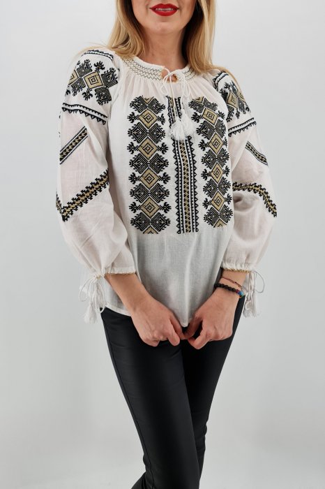 Ie din panza de bumbac 100%. Broderie cusuta la masina. Culoare: alb cu broderie neagra si fir auriu Marimi disponibile: de la S la 3XL Modelul din imagine are 170cm, 60kg, 92cm in bust si poarta masura M. ! Se recomanda spalare la masina la 30 grade, de preferat spalare manuala. ! Nu iese culoarea din broderie, materialul nu intra la apa!