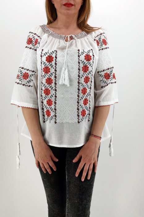 Ie din panza de bumbac 100%, Broderie cusuta la masina. Bluza lejera de purtat in orice moment al zilei. Culoare: alba cu broderie rosie si verde , , , , , , , Marimi disponibile: S -100cm circumferinta bustului, 65 cm lungime, M -105cm circumferinta bustului, 65 cm lungime, L , 110cm circumferinta bustului, 66 cm lungime, XL , 115cm circumferinta bustului, 67 cm lungime. XXL , 120cm circumferinta bustului, 68 cm lungime Modelul din imagine are 170cm, 60kg, 92cm in bust si poarta masura S.