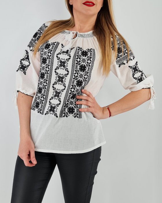 Ie din panza de bumbac 100%. Broderie cusuta la masina. Culoare: alb cu broderie neagra. Marimi disponibile: S -100cm circumferinta bustului, 65 cm lungime, M -105cm circumferinta bustului, 65 cm lungime, L , 110cm circumferinta bustului, 66 cm lungime, XL , 115cm circumferinta bustului, 67 cm lungime. 2XL , 120cm circumferinta bustului, 68 cm lungime Modelul din imagine are 170cm, 60kg, 92cm in bust si poarta masura S. ! Se recomanda spalare la masina la 30 grade, de preferat spalare manuala. ! Nu iese culoarea din broderie, materialul nu intra la apa!