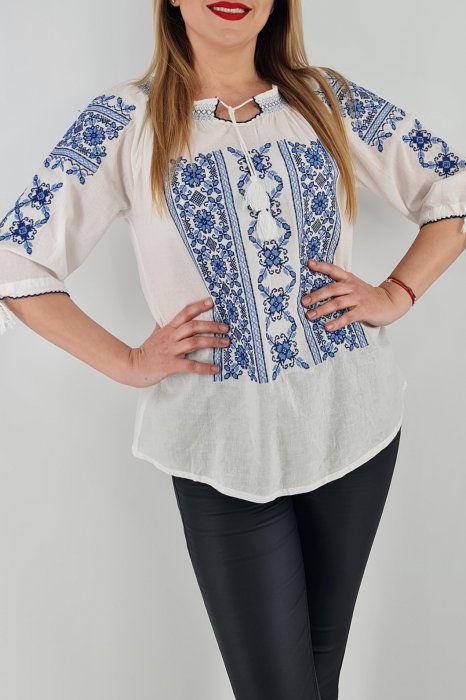 Ie din panza de bumbac 100%. Broderie cusuta la masina. Culoare: alb cu broderie neagra. Marimi disponibile: S -100cm circumferinta bustului, 65 cm lungime, M -105cm circumferinta bustului, 65 cm lungime, L , 110cm circumferinta bustului, 66 cm lungime, XL , 115cm circumferinta bustului, 67 cm lungime. 2XL , 120cm circumferinta bustului, 68 cm lungime Modelul din imagine are 170cm, 60kg, 92cm in bust si poarta masura S. ! Se recomanda spalare la masina la 30 grade, de preferat spalare manuala. ! Nu iese culoarea din broderie, materialul nu intra la apa!
