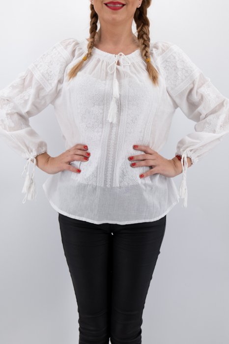 Ie din panza de bumbac 100%. Broderie cusuta la masina. Bluza lejera de purtat in orice moment al zilei. Culoare: alba cu broderie alba Marimi disponibile: L , 110cm circumferinta bustului, 66 cm lungime, Modelul din imagine are 170cm, 60kg, 92cm in bust si poarta masura S.