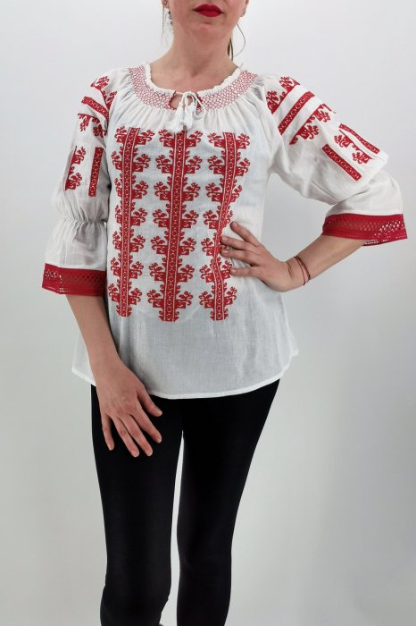 Ie din panza de bumbac 100%, Broderie cusuta la masina. Culoare: alba cu broderie rosie. Prevazuta cu maneca 3 4. Marimi disponibile: S -100cm circumferinta bustului, 65 cm lungime, M -105cm circumferinta bustului, 65 cm lungime, L , 110cm circumferinta bustului, 66 cm lungime, XL , 115cm circumferinta bustului, 67 cm lungime. 2XL , 120cm circumferinta bustului, 68 cm lungime 3XL , 130cm circumferinta bustului, 70 cm lungime Modelul din imagine are 170cm, 60kg, 92cm in bust si poarta masura S. ! Se recomanda spalare la masina la 30 grade, de preferat spalare manuala. ! Nu iese culoarea din broderie, materialul nu intra la apa!