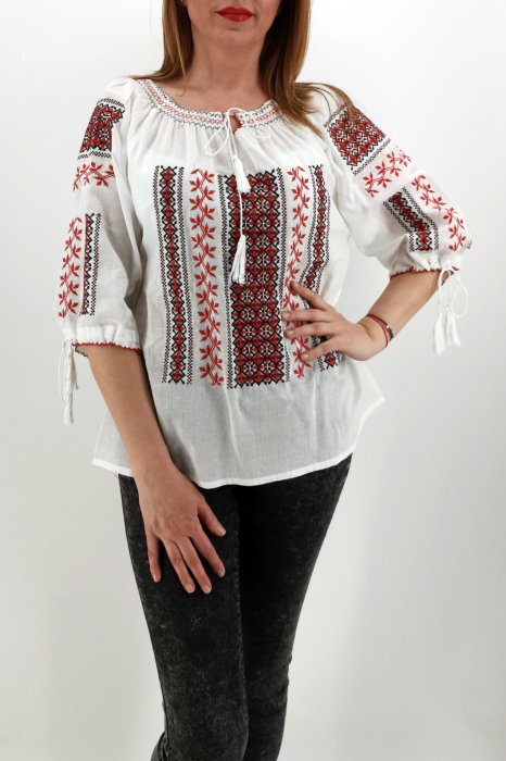 Ie din panza de bumbac 100%. Broderie cusuta la masina. Culoare: alb cu broderie, rosie si neagra. Marimi disponibile: S -100cm circumferinta bustului, 65 cm lungime, M -105cm circumferinta bustului, 65 cm lungime, L , 110cm circumferinta bustului, 66 cm lungime, XL , 115cm circumferinta bustului, 67 cm lungime. 2XL , 120cm circumferinta bustului, 68 cm lungime Modelul din imagine are 170cm, 60kg, 92cm in bust si poarta masura S. ! Se recomanda spalare la masina la 30 grade, de preferat spalare manuala. ! Nu iese culoarea din broderie, materialul nu intra la apa!