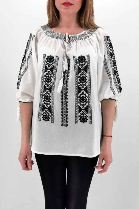 Ie din panza de bumbac 100%, Broderie cusuta la masina. Culoare: alba cu broderie neagra Marimi disponibile: S -100cm circumferinta bustului, 65 cm lungime, M -105cm circumferinta bustului, 65 cm lungime, L , 110cm circumferinta bustului, 66 cm lungime, XL , 115cm circumferinta bustului, 67 cm lungime. 2XL , 120cm circumferinta bustului, 68 cm lungime Modelul din imagine are 170cm, 60kg, 92cm in bust si poarta masura S. ! Se recomanda spalare la masina la 30 grade, de preferat spalare manuala. ! Nu iese culoarea din broderie, materialul nu intra la apa!