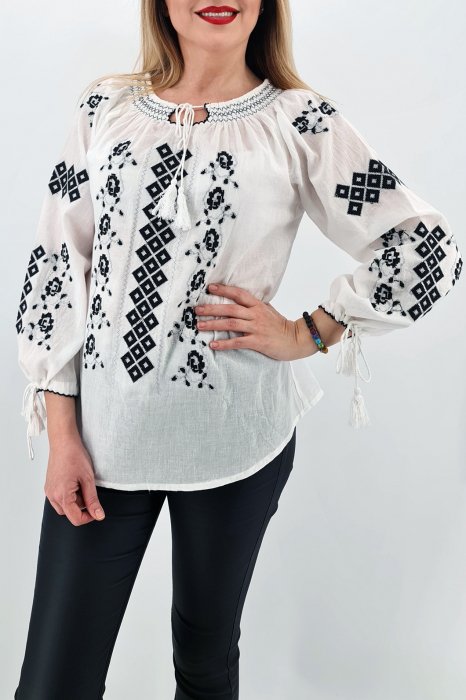 Ie din panza de bumbac 100%. Broderie cusuta la masina. Culoare: alb cu broderie neagra si fir argintiu Marimi disponibile: de la S la 3XL Modelul din imagine are 170cm, 60kg, 92cm in bust si poarta masura M. ! Se recomanda spalare la masina la 30 grade, de preferat spalare manuala. ! Nu iese culoarea din broderie, materialul nu intra la apa!