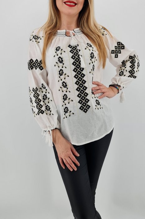 Ie din panza de bumbac 100%. Broderie cusuta la masina. Culoare: alb cu broderie neagra si fir auriu Marimi disponibile: de la S la 3XL Modelul din imagine are 170cm, 60kg, 92cm in bust si poarta masura M. ! Se recomanda spalare la masina la 30 grade, de preferat spalare manuala. ! Nu iese culoarea din broderie, materialul nu intra la apa!