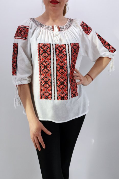 Ie din panza de bumbac 100%. Broderie cusuta la masina. Culoare: alb cu broderie, rosie si neagra. Marimi disponibile: S -100cm circumferinta bustului, 65 cm lungime, M -105cm circumferinta bustului, 65 cm lungime, L , 110cm circumferinta bustului, 66 cm lungime, XL , 115cm circumferinta bustului, 67 cm lungime. 2XL , 120cm circumferinta bustului, 68 cm lungime Modelul din imagine are 170cm, 60kg, 92cm in bust si poarta masura S. ! Se recomanda spalare la masina la 30 grade, de preferat spalare manuala. ! Nu iese culoarea din broderie, materialul nu intra la apa!