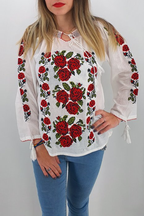 Ie din panza de bumbac 100%, Broderie cusuta la masina. Culoare: alba cu broderie rosie, verde si neagra Marimi disponibile: S -100cm circumferinta bustului, 65 cm lungime, M -105cm circumferinta bustului, 65 cm lungime, L , 110cm circumferinta bustului, 66 cm lungime, XL , 115cm circumferinta bustului, 67 cm lungime. 2XL , 120cm circumferinta bustului, 68 cm lungime Modelul din imagine are 170cm, 60kg, 92cm in bust si poarta masura S. ! Se recomanda spalare la masina la 30 grade, de preferat spalare manuala. ! Nu iese culoarea din broderie, materialul nu intra la apa!