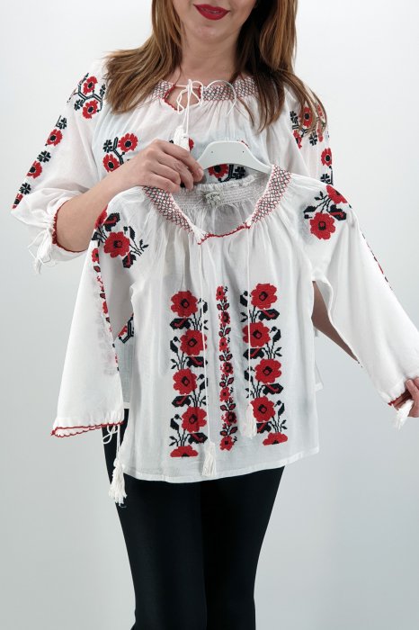 Ie traditionala fetite Sabrina Material: bumbac 100%. Broderia este cusuta la masina Culoare: alba cu broderie rosie si neagra. Marimi disponibile: masura 2 , pentru copii 0-2 ani , 70cm circumferinta bust, 44cm lungime bluza. masura 4 , pentru copii 2-4 ani , 72cm circumferinta bust, 47cm lungime bluza. masura 6 , pentru copii 4-6 ani , 78cm circumferinta bust, 47cm lungime bluza. masura 8 , pentru copii 6-8 ani , 82cm circumferinta bust, 45cm lungime bluza. masura 10 , pentru copii 8-10 ani , 88cm circumferinta bust, 48cm lungime bluza. masura 12 , pentru copii 10-12 ani , 90cm circumferinta bust, 50cm lungime bluza. masura 14 , pentru copii 12-14 ani , 96cm circumferinta bust, 52cm lungime bluza. masura 16 , pentru copii 14-16 ani , 98cm circumferinta bust, 57cm lungime bluza.