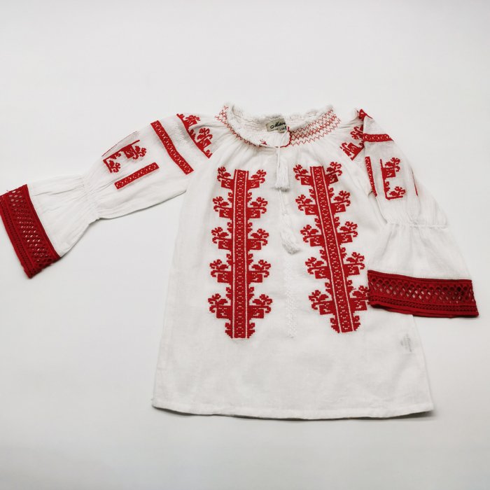 Ie traditionala fetite Sabrina Material: bumbac 100%. Broderia este cusuta la masina Culoare: alba cu broderie rosie si neagra. Marimi disponibile: masura 2 , pentru copii 0-2 ani , 70cm circumferinta bust, 44cm lungime bluza. masura 4 , pentru copii 2-4 ani , 72cm circumferinta bust, 47cm lungime bluza. masura 6 , pentru copii 4-6 ani , 78cm circumferinta bust, 47cm lungime bluza. masura 8 , pentru copii 6-8 ani , 82cm circumferinta bust, 45cm lungime bluza. masura 10 , pentru copii 8-10 ani , 88cm circumferinta bust, 48cm lungime bluza. masura 12 , pentru copii 10-12 ani , 90cm circumferinta bust, 50cm lungime bluza. masura 14 , pentru copii 12-14 ani , 96cm circumferinta bust, 52cm lungime bluza. masura 16 , pentru copii 14-16 ani , 98cm circumferinta bust, 57cm lungime bluza.