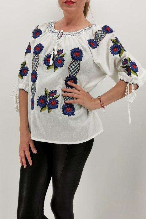 Ie din panza de bumbac 100%. Broderie cusuta la masina. Culoare: alb cu broderie albastra, rosie si verde Marimi disponibile: S -100cm circumferinta bustului, 65 cm lungime, M -105cm circumferinta bustului, 65 cm lungime, L , 110cm circumferinta bustului, 66 cm lungime, XL , 115cm circumferinta bustului, 67 cm lungime. 2XL , 120cm circumferinta bustului, 68 cm lungime 3XL , 125cm circumferinta bustului, 68 cm lungime Modelul din imagine are 170cm, 60kg, 92cm in bust si poarta masura S.
