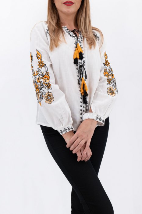 Ie din panza de bumbac 100%. Broderie cusuta la masina. Culoare: alb cu broderie aurie Marimi disponibile: S -100cm circumferinta bustului, 65 cm lungime, M -105cm circumferinta bustului, 65 cm lungime, L , 110cm circumferinta bustului, 66 cm lungime, XL , 115cm circumferinta bustului, 67 cm lungime. 2XL , 120cm circumferinta bustului, 68 cm lungime 3XL , 125cm circumferinta bustului, 68 cm lungime Modelul din imagine are 170cm, 60kg, 92cm in bust si poarta masura S. ! Se recomanda spalare la masina la 30 grade, de preferat spalare manuala. ! Nu iese culoarea din broderie, materialul nu intra la apa!
