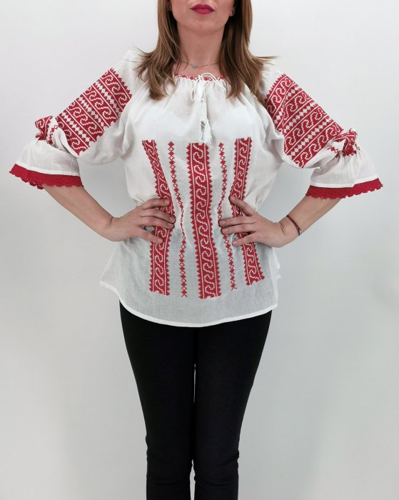 IIe din panza de bumbac 100%. Broderie cusuta la masina. Bluza cu maneca lunga. Culoare : alba cu broderie rosie , , , , , , , Marimi disponibile: S -100cm circumferinta bustului, 65 cm lungime, M -105cm circumferinta bustului, 65 cm lungime, L , 110cm circumferinta bustului, 66 cm lungime, XL , 115cm circumferinta bustului, 67 cm lungime. XXL , 120cm circumferinta bustului, 68 cm lungime Modelul din imagine are 170cm, 60kg, 92cm in bust si poarta masura S.
