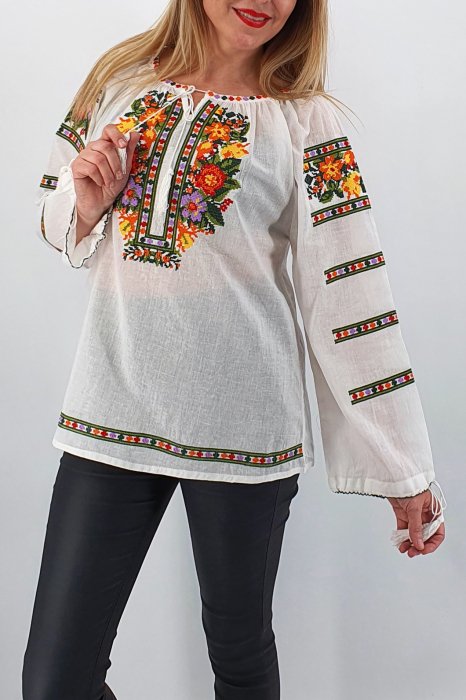 Ie din panza de bumbac 100%, Broderie cusuta la masina. Bluza lejera de purtat in orice moment al zilei. Culoare: alb cu broderie albastra, rosu, verde, mov, albastru. Marimi disponibile: S -100cm circumferinta bustului, 65 cm lungime, M -105cm circumferinta bustului, 65 cm lungime, L , 110cm circumferinta bustului, 66 cm lungime, XL , 115cm circumferinta bustului, 67 cm lungime. 2XL , 120cm circumferinta bustului, 67 cm lungime, 3XL , 125cm circumferinta bustului, 68 cm lungime, Modelul din imagine are 170cm, 60kg, 92cm in bust si poarta masura S.