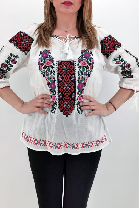 Ie din panza de bumbac 100%, Broderie cusuta la masina. Culoare: alb cu broderie mov, roz, verde, rosu si negru Marimi disponibile: S -100cm circumferinta bustului, 65 cm lungime, M -105cm circumferinta bustului, 65 cm lungime, L , 110cm circumferinta bustului, 66 cm lungime, XL , 115cm circumferinta bustului, 67 cm lungime. 2XL , 120cm circumferinta bustului, 67 cm lungime. 3XL , 125cm circumferinta bustului, 68 cm lungime Modelul din imagine are 170cm, 60kg, 92cm in bust si poarta masura S. ! Se recomanda spalare la masina la 30 grade, de preferat spalare manuala. ! Nu iese culoarea din broderie, materialul nu intra la apa!