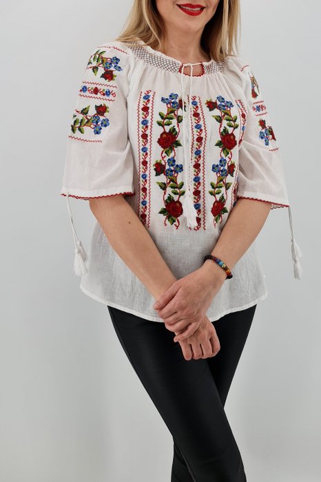 Ie din panza de bumbac 100%, Broderie cusuta la masina. Maneca lunga! Culoare: alb cu broderie rosie, albastra si verde Marimi disponibile: S -100cm circumferinta bustului, 65 cm lungime, M -105cm circumferinta bustului, 65 cm lungime, L , 110cm circumferinta bustului, 66 cm lungime, XL , 115cm circumferinta bustului, 67 cm lungime. 2XL , 120cm circumferinta bustului, 68 cm lungime Modelul din imagine are 170cm, 60kg, 92cm in bust si poarta masura S. ! Se recomanda spalare la masina la 30 grade, de preferat spalare manuala. ! Nu iese culoarea din broderie, materialul nu intra la apa!