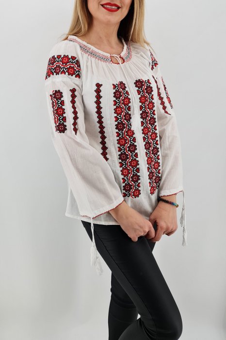 Ie din panza de bumbac 100%, Broderie cusuta la masina. Culoare: alb cu broderie rosie Marimi disponibile: S -100cm circumferinta bustului, 65 cm lungime, M -105cm circumferinta bustului, 65 cm lungime, L , 110cm circumferinta bustului, 66 cm lungime, XL , 115cm circumferinta bustului, 67 cm lungime. 2XL , 120cm circumferinta bustului, 68 cm lungime 3XL , 125cm circumferinta bustului, 68 cm lungime Modelul din imagine are 170cm, 60kg, 92cm in bust si poarta masura S. ! Se recomanda spalare la masina la 30 grade, de preferat spalare manuala. ! Nu iese culoarea din broderie, materialul nu intra la apa!