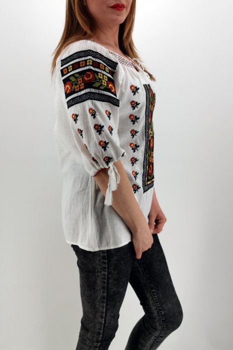 Ie din panza de bumbac 100%, Broderie cusuta la masina. Culoare: alba cu broderie rosu, verde, galbena si negru. Marimi disponibile: S -100cm circumferinta bustului, 65 cm lungime, M -105cm circumferinta bustului, 65 cm lungime, L , 110cm circumferinta bustului, 66 cm lungime, XL , 115cm circumferinta bustului, 67 cm lungime. 2XL , 120cm circumferinta bustului, 68 cm lungime Modelul din imagine are 170cm, 60kg, 92cm in bust si poarta masura S. ! Se recomanda spalare la masina la 30 grade, de preferat spalare manuala. ! Nu iese culoarea din broderie, materialul nu intra la apa!
