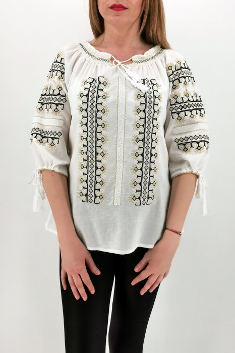 Ie din panza de bumbac 100%, Broderie cusuta la masina. Culoare: alb cu broderie neagra si crem Marimi disponibile: S -100cm circumferinta bustului, 65 cm lungime, M -105cm circumferinta bustului, 65 cm lungime, L , 110cm circumferinta bustului, 66 cm lungime, XL , 115cm circumferinta bustului, 67 cm lungime. 2XL , 120cm circumferinta bustului, 67 cm lungime. Modelul din imagine are 170cm, 60kg, 92cm in bust si poarta masura S. ! Se recomanda spalare la masina la 30 grade, de preferat spalare manuala. ! Nu iese culoarea din broderie, materialul nu intra la apa!