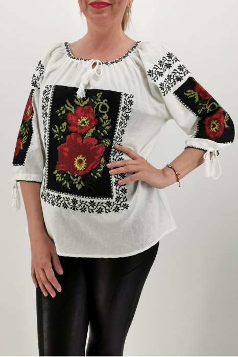 Ie din panza de bumbac 100%, Broderie cusuta la masina. Culoare: alba cu broderie rosie-roz, verde si neagra Marimi disponibile: S -100cm circumferinta bustului, 65 cm lungime, M -105cm circumferinta bustului, 65 cm lungime, L , 110cm circumferinta bustului, 66 cm lungime, XL , 115cm circumferinta bustului, 67 cm lungime. 2XL , 120cm circumferinta bustului, 68 cm lungime Modelul din imagine are 170cm, 60kg, 92cm in bust si poarta masura S. ! Se recomanda spalare la masina la 30 grade, de preferat spalare manuala. ! Nu iese culoarea din broderie, materialul nu intra la apa!