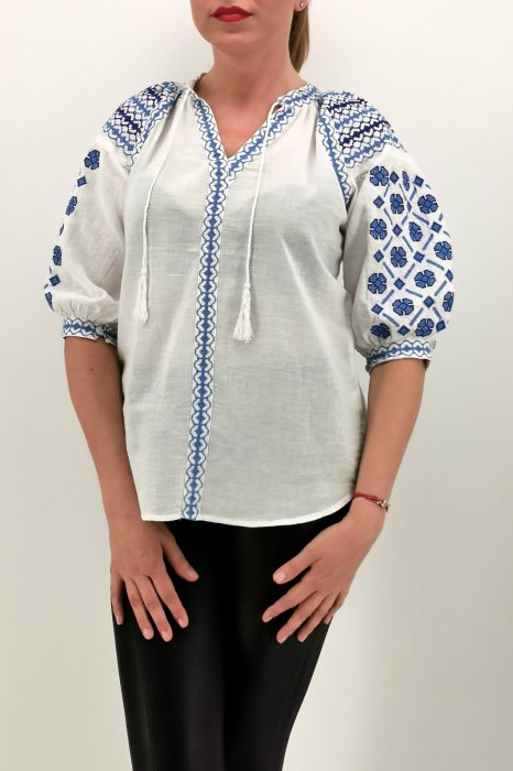 Ie din panza de bumbac 100%, Broderie cusuta la masina. Culoare: alba cu broderie albastra, Marimi disponibile: S -100cm circumferinta bustului, 65 cm lungime, M -105cm circumferinta bustului, 65 cm lungime, L , 110cm circumferinta bustului, 66 cm lungime, XL , 115cm circumferinta bustului, 67 cm lungime. 2XL , 120cm circumferinta bustului, 68 cm lungime Modelul din imagine are 170cm, 60kg, 92cm in bust si poarta masura S. ! Se recomanda spalare la masina la 30 grade, de preferat spalare manuala. ! Nu iese culoarea din broderie, materialul nu intra la apa!