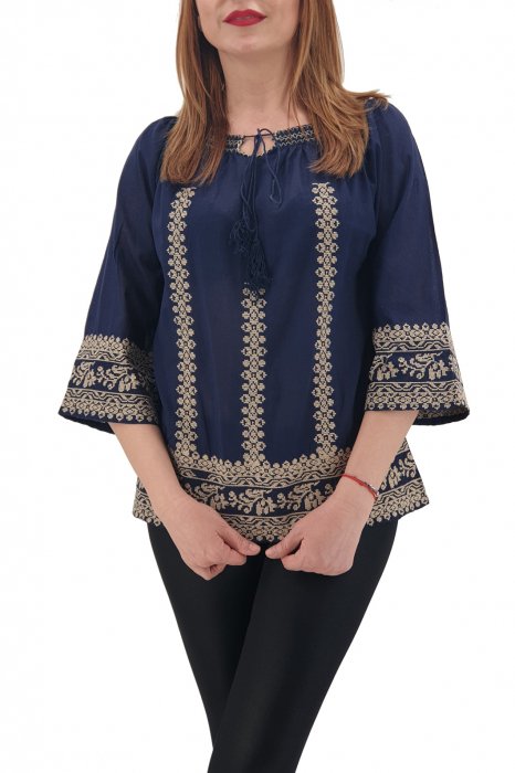 Ie din panza de bumbac 100%, Broderie cusuta la masina. Bluza lejera de purtat in orice moment al zilei. Culoare: bleumarin cu broderie crem , , , , , , , Marimi disponibile: S -100cm circumferinta bustului, 65 cm lungime, M -105cm circumferinta bustului, 65 cm lungime, L , 110cm circumferinta bustului, 66 cm lungime, XL , 115cm circumferinta bustului, 67 cm lungime. Modelul din imagine are 170cm, 60kg, 92cm in bust si poarta masura S.