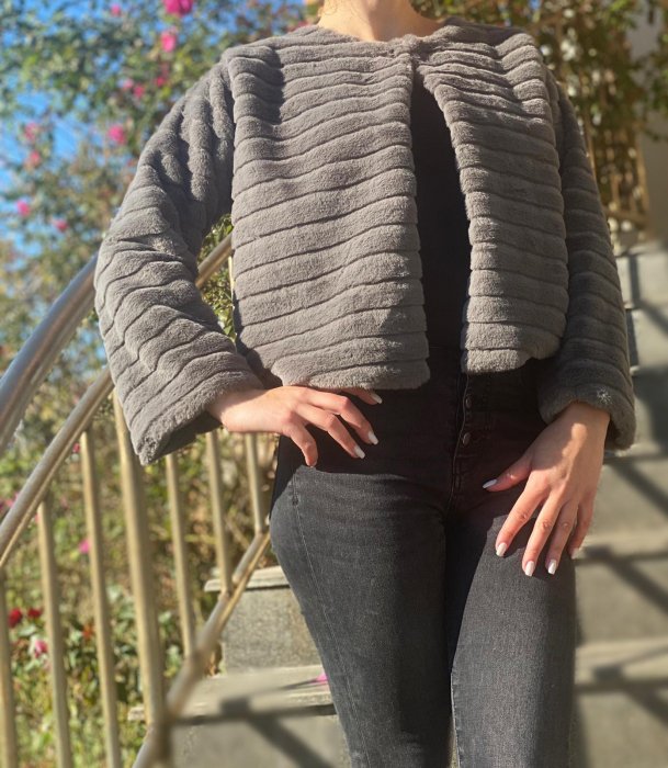 Comandă produsul Jacheta cu talie scurta din blana sintetica – gri la prețul de 159.0 lei