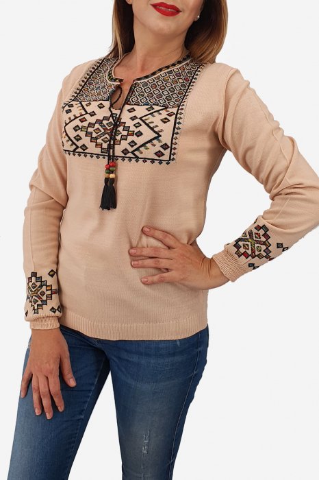 Pulover elegant din casmir, cu broderie cusuta la masina. Material: 53% casmir, 37% elastan, Marime universala: 108 cm bust, 58 cm lungime Culoare: roz pal Pulover lejer la purtat cu maneca lunga. Modelul din imagine are 1.70 m, 60kg, 90cm circumferinta bustului.