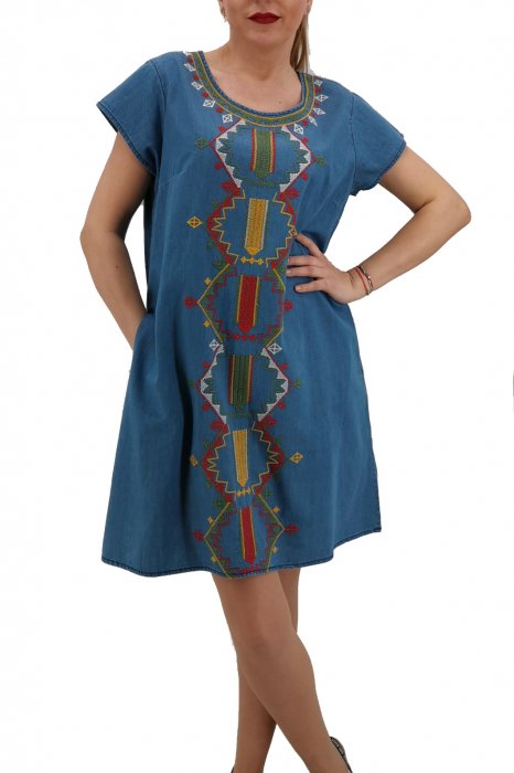 Rochie din bumbac cu broderie cusuta la masina Rochia nu este transparenta, cu buzunare, fara elastic in talie si cu maneca scurta. Material: bumbac cu aspect de denim (blug) Culoare: albastru, alb, rosu Marimi: L: 102 cm circumferinta bust, 90 cm lungime; XL: 107 circumferinta bust, 91 cm lungime; XXL: 112 cm circumferinta bust, 92 cm lungime. Modelul din imagine are 1.70 m, 60 kg, 94 cm circumferinta bustului si poarta L in poza.