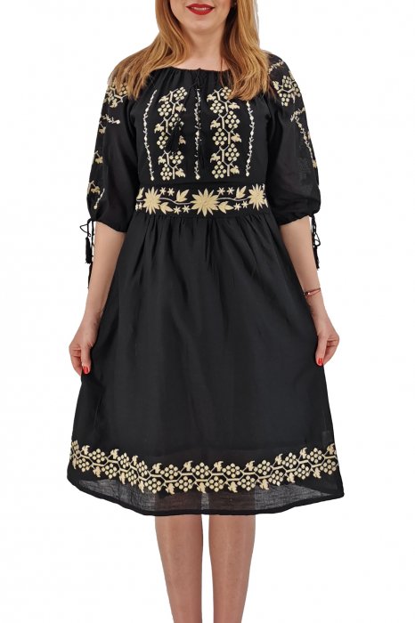 Material: bumbac 100%. Broderie cusuta la masina Culoare: neagra cu broderie rosie si alba Marimi disponibile: S , 100cm circumferinta bustului, 105cm lungime M , 105cm circumferinta bustului,105cm lungime, L , 110cm circumferinta bustului, 106cm lungime, XL , 115cm circumferinta bustului, 106cm lungime, XXL-120cm circumferinta bustului, 107cm lungime. Rochia este prevazuta cu jupa, elastic in talie si maneca 3 4. Rochie lejera la purtat. Modelul din imagine are 1.70 m, 60 kg, 90 cm circumferinta bustului si poarta S in poza.