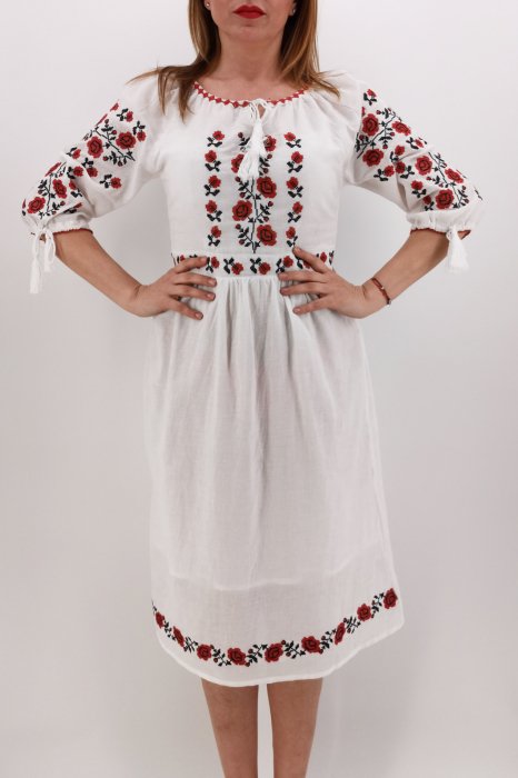 Material: bumbac 100%. Broderie cusuta la masina Culoare: alb cu broderie rosie si neagra Marimi disponibile: S , 100cm circumferinta bustului, 105cm lungime M , 105cm circumferinta bustului,105cm lungime, L , 110cm circumferinta bustului, 106cm lungime, XL , 115cm circumferinta bustului, 106cm lungime, 2XL-120cm circumferinta bustului, 107cm lungime. Rochia este prevazuta cu jupa, elastic in talie si maneca 3 4. Rochie lejera la purtat. Modelul din imagine are 1.70 m, 60 kg, 90 cm circumferinta bustului si poarta S in poza.