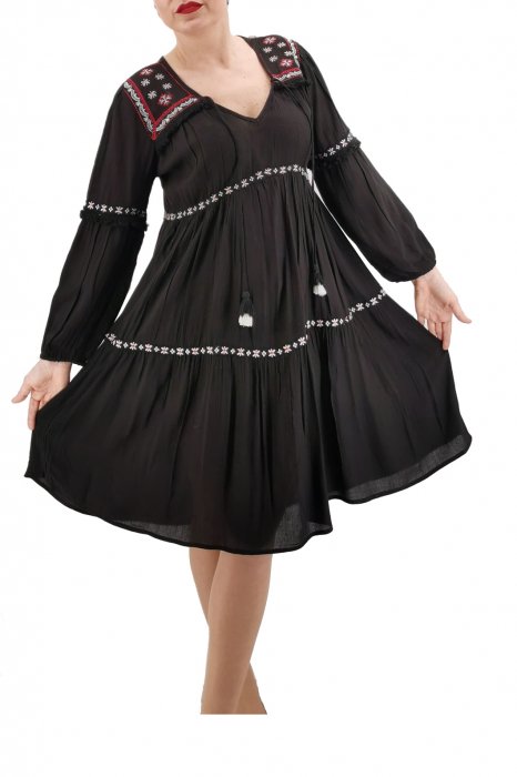 Material: vascoza. Broderie cusuta la masina. Culoare: negru cu broderie alba si roz. Marimi: M , 110 cm bust, 90 cm talie, 150 cm sold, 105 cm lungime L , 114 cm bust, 94 cm talie, 154 cm sold, 107 cm lungime XL , 118 cm bust, 98 cm talie, 158 cm sold, 109 cm lungime Rochia nu este transparenta, are maneca lunga. Rochie lejera la purtat. Modelul din imagine are 1.70 m, 60 kg, 94 cm circumferinta bustului si poarta M in poza. ! Se recomanda spalare la masina la 30 grade, de preferat spalare manuala. ! Nu iese culoarea din broderie, materialul nu intra la apa!