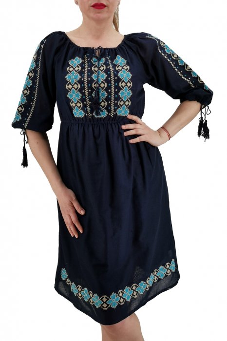 Material: bumbac 100%. Broderie cusuta la masina Culoare: neagra cu broderie rosie si alba Marimi disponibile: S , 100cm circumferinta bustului, 105cm lungime M , 105cm circumferinta bustului,105cm lungime, L , 110cm circumferinta bustului, 106cm lungime, XL , 115cm circumferinta bustului, 106cm lungime, XXL-120cm circumferinta bustului, 107cm lungime. Rochia este prevazuta cu jupa, elastic in talie si maneca 3 4. Rochie lejera la purtat. Modelul din imagine are 1.70 m, 60 kg, 90 cm circumferinta bustului si poarta S in poza.