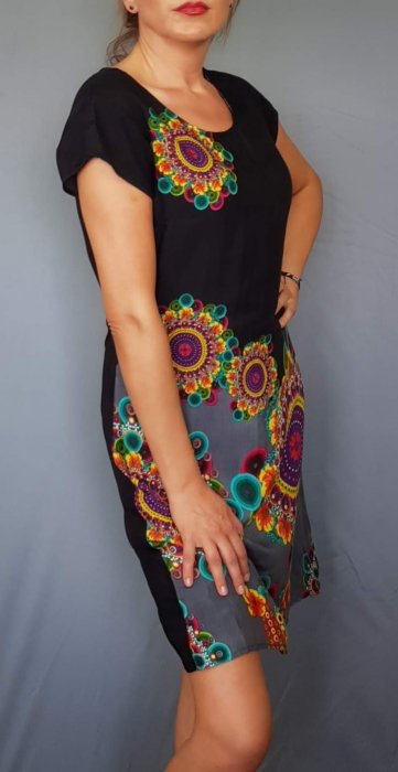 Rochie cu imprimeu si croi lejer. Rochia este dublata, fara elastic in talie si cu maneca scurta. Material: vascoza. Culoare: negru, multicolor. Marimi: M: 96 cm circumferinta bust, 96 cm lungime; L: 100 cm circumferinta bust, 96 cm lungime; XL: 104 cm circumferinta bust, 96 cm lungime; XXL: 108 cm circumferinta bust, 96 cm lungime Modelul din imagine are 1.70 m, 60 kg, 94 cm circumferinta bustului si poarta M in poza.