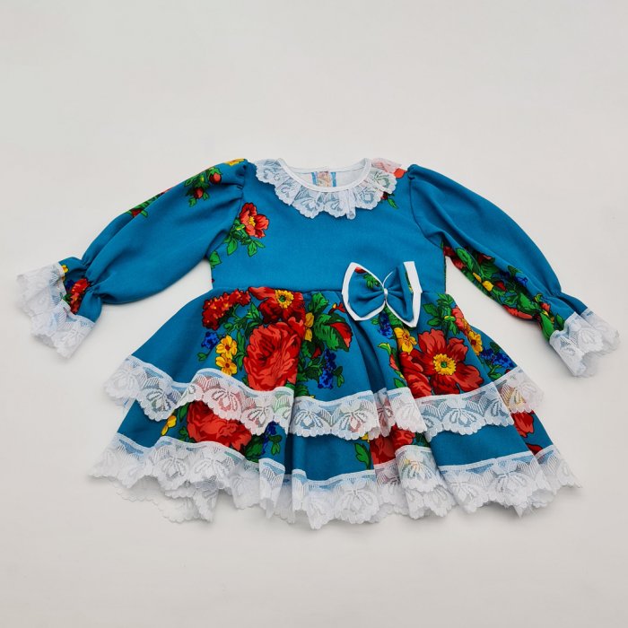 Produs fabricat in Romania. Material: bumbac 100% Rochita cu tematica florala si dantela, este deosebit de jucausa si vesela. Culoare: albastru cu imprimeu floral rosu, verde si galben Material: 95% poliester si 5% bumbac Marimi disponibile: masura 0 – 0 – 3 luni (rochita bust – 48cm; lungime 36cm; lungime maneca – 30cm;) masura 2 – 3 – 6 luni (rochita bust – 50cm; lungime 38cm; lungime maneca – 32cm;) ! Se recomanda spalare la masina la 30 grade, de preferat spalare manuala. ! Nu iese culoarea din broderie, materialul nu intra la apa!