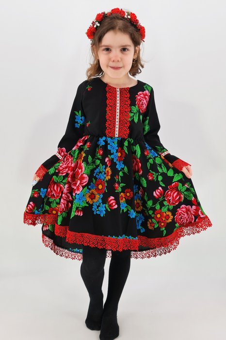 Produs fabricat in Romania. Material: bumbac 5% si poliester 95% Rochita cu tematica florala si dantela, este deosebit de jucausa si vesela. Culoare: verde cu imprimeu floral rosu si verde. Material: 95% poliester si 5% bumbac Marimi disponibile: masura 4 – pentru 4 ani (rochita bust – 55cm; lungime 60cm;) masura 5 – pentru 5 ani (rochita bust – 60cm; lungime 61cm;) masura 6 – pentru 6 ani (rochita bust – 65cm; lungime 62cm;) ! Se recomanda spalare la masina la 30 grade, de preferat spalare manuala. ! Nu iese culoarea din broderie, materialul nu intra la apa!