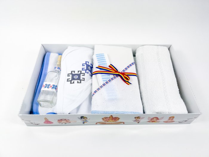 Trusoul de botez a fost creat special pentru baietel, pentru un botez cu tematica traditionala romaneasca. Trusoul este compus din urmatoarele: prosop baie, prosop preot, panza mir, sticluta ulei, pled bumbac. prosop alb pentru preot, lungime aprox. 87 cm si latime aprox. 46 cm; panza de mir, lungime aprox. 105 cm si latime aprox. 97 cm; prosop bebe, lungime aprox. 72 cm si latime aprox. 74 cm; paturica bebe, lungime aprox. 77 cm si latime aprox. 70 cm; sticluta mir cu panglica alb si albastru; fasa mir cu panglica alb si albastru;